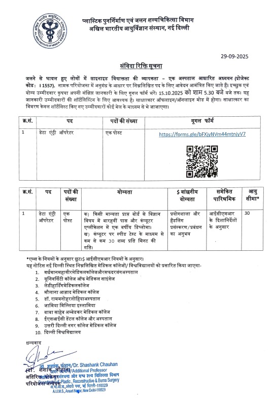 AIIMS New Delhi Recruitment 2025 : All India Institute of Medical Sciences (AIIMS) New Delhi has released the latest notification for the recruitment of Data Entry Operator Posts. The AIIMS New Delhi Recruitment 2025 Notification has been released and the Online applications started. The eligible candidates can apply Online for the AIIMS New Delhi Vacancy 2025 starting from 01.10.2025. The details for AIIMS New Delhi Bharti 2025 can read below on Sarkari Result Ind and also from official website.