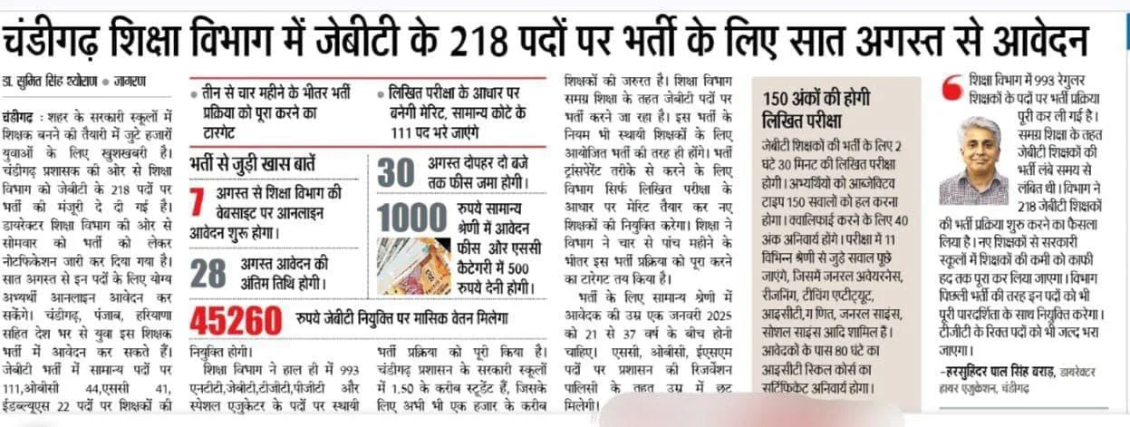 Chandigarh JBT Recruitment 2025 : The Education Department, Chandigarh Administrationhas released the latest notification for the recruitment of Junior Basic Training (JBT)/ Primary Teacher/ PRT Post. The Chandigarh JBT Recruitment 2025 Notification has been released and the Online applications started. The eligible candidates can apply Online for the Chandigarh JBT Vacancy 2025 starting from 07.08.2025. The details for Chandigarh JBT Bharti 2025 can read below on Sarkari Result Ind and also from official website.