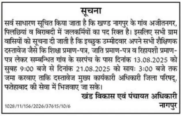 Haryana Tubewell Operator Recruitment 2025 : Block Development and Panchayat Department, Fatehabad (District. Fatehabad) has released the latest notification for the recruitment of Tubewell Operator. The Haryana Tubewell Operator Recruitment 2025 Notification has been released and the Offline applications started. The eligible candidates can apply Offline for the Haryana Tubewell Operator Vacancy 2025 starting from 13 August 2025. The details for Haryana Tubewell Operator Bharti 2025 can read below on Sarkari Result Ind and also from official website.