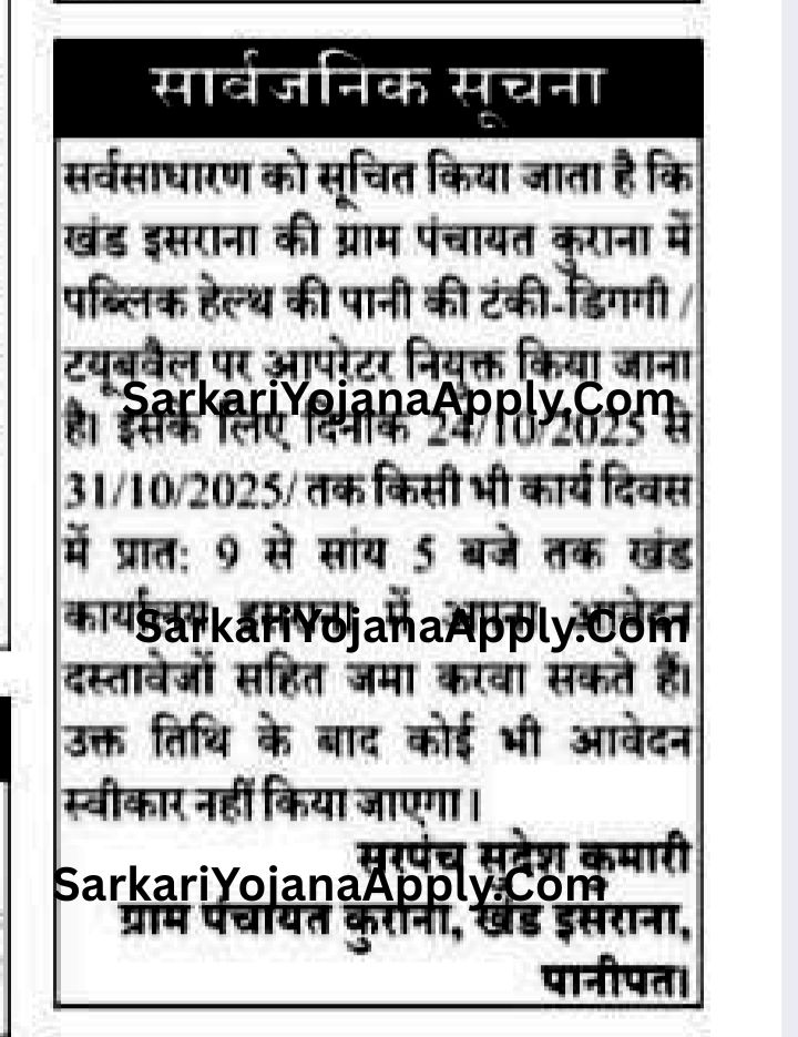 Haryana Tubewell Operator Vacancy 2025 Apply Offline Form | हरियाणा ट्यूबवेल ऑपरेटर भर्ती 2025